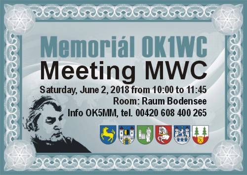Termín setkání: sobota 2/06/2018 10:00, místo setkání: salónek "Raum Bodensee". Pořadatel Friedrichshafenského setkání (DARC) zaregistroval toto setkání pod názvem "OK1WC Memorial Contest Meeting".