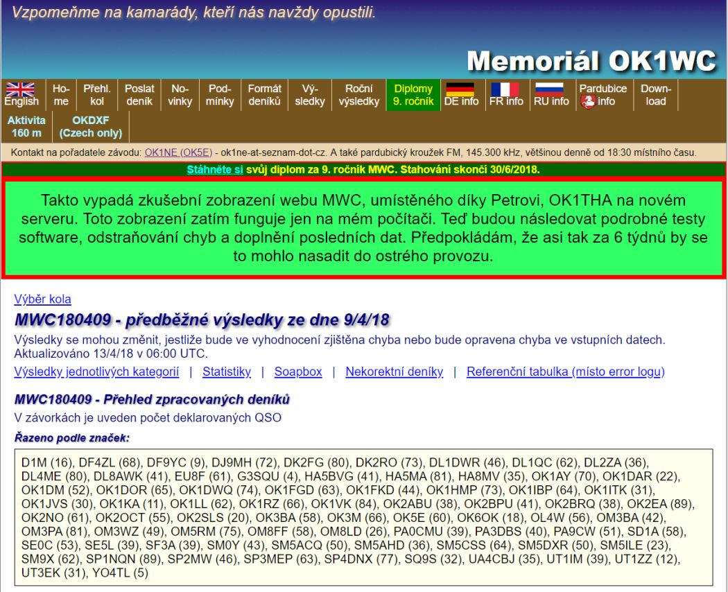 Jestli se nestane nic neočekávaného, tak v sobotu 19/5/18 dojde k přepnutí domény http://www.memorial-ok1wc.cz na nový server. Nový server poznáte podle nazelenalého písma v záhlaví: